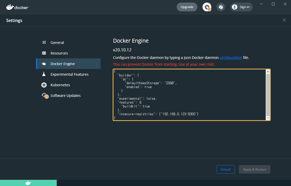 예제 ) "insecure-registries" : ["192.168.0.123:5000"]