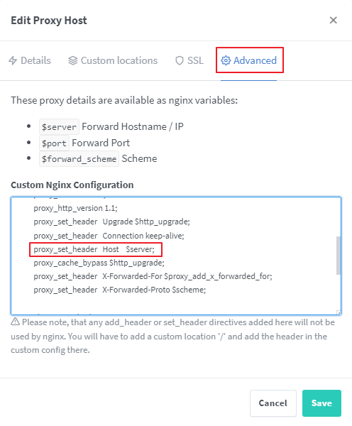 아래와 같이 Advanced에서 proxy_set_header의 Host 값이 IIS에 설정된 도메인을 적어 주시면 됩니다.