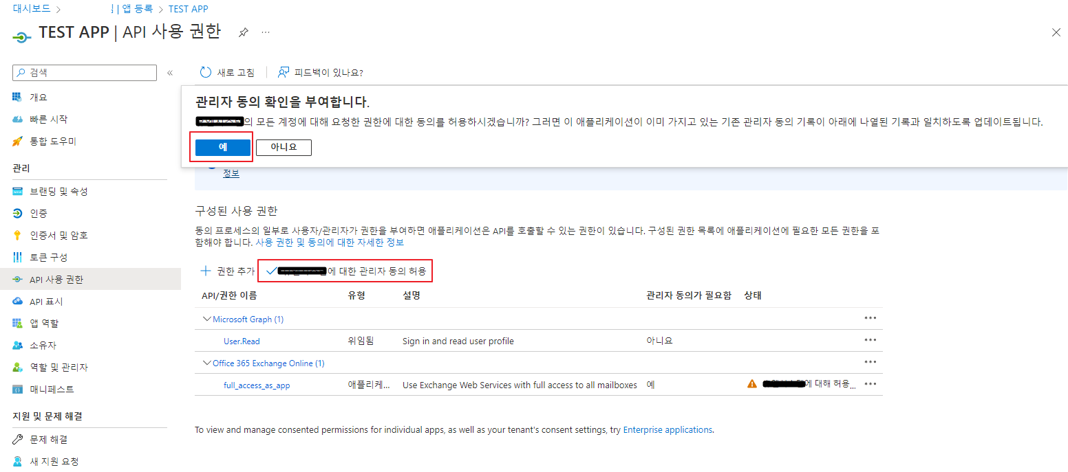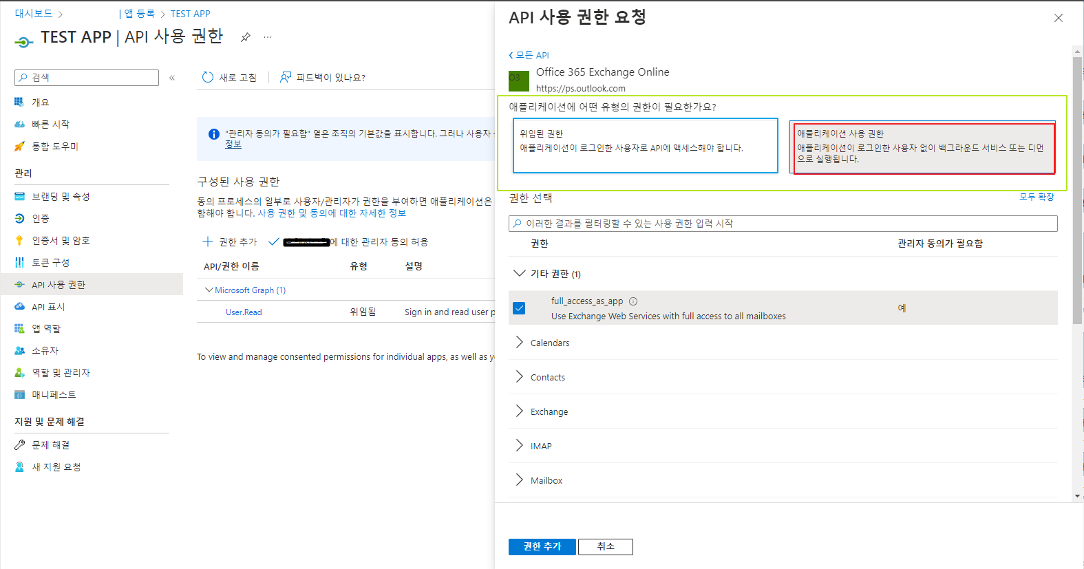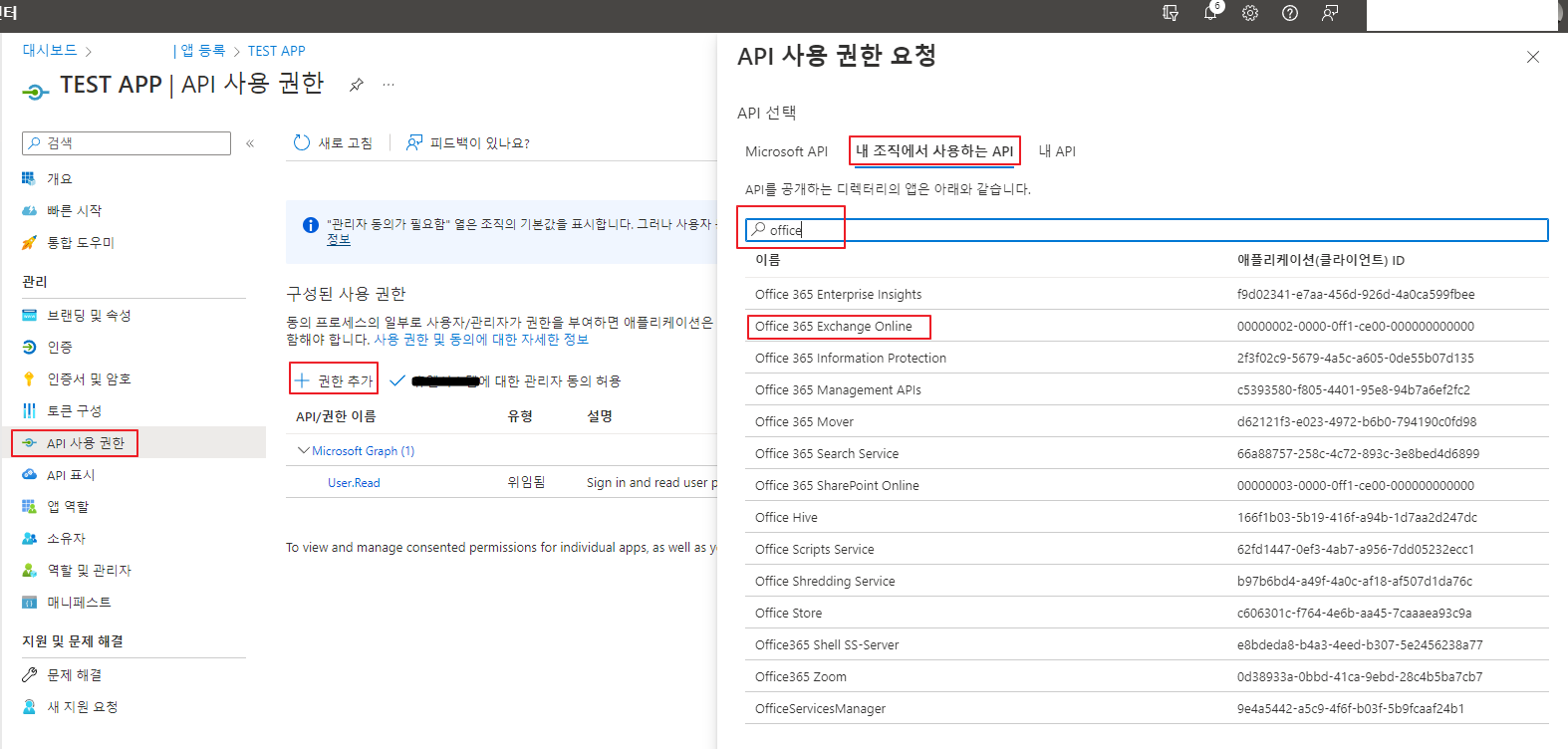 API 사용 권한 -> 권한 추가 -> 내 조직에서 사용하는 API -> 검색어 office -> Office 365 Exchange Online 선택