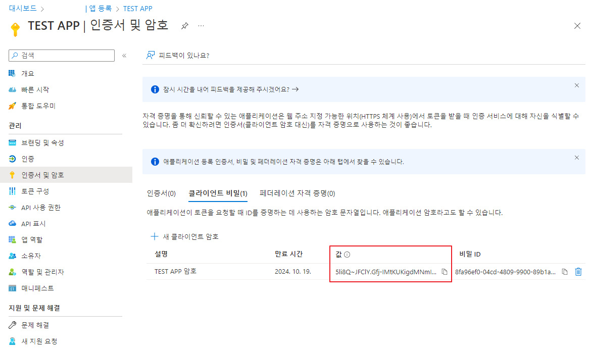 비밀값은 생성 직후만 볼 수 있으며 이후 감춰지니 미리 복사해서 다른 곳에 보관