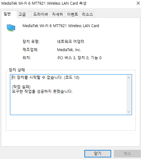 [노트북] MediaTek Wi-Fi 6 - 이 장치를 시작할 수 없습니다.(코드 10)