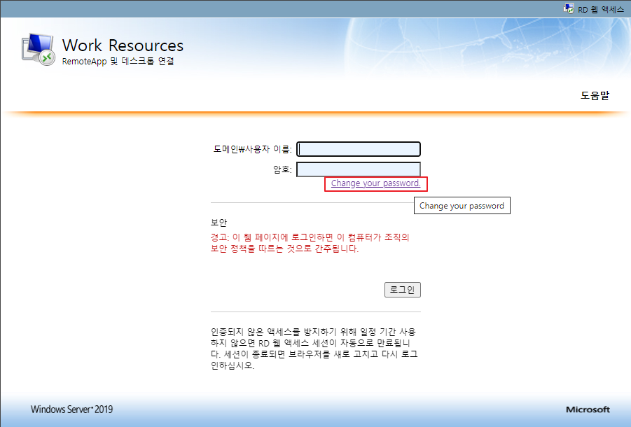 설정이 완료되었으며 패스워드 만료등으로 인한 비밀번호 변경이 필요한 경우 해당 페이지를 사용하면 됩니다.