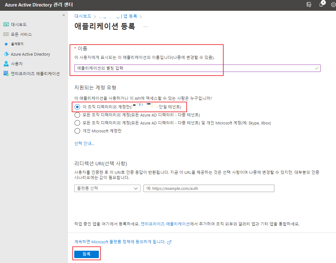 1. Azure Active Directory 관리 센터 접속 -> Azure Active Directory -> 앱 등록 -> 새 등록